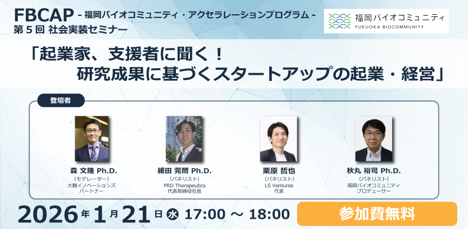 福岡バイオコミュニティ・アクセラレーションプログラム(FBCAP)「ピッチイベント」を開催します。優れたシーズへのアクセスの機会としてご活⽤ください。